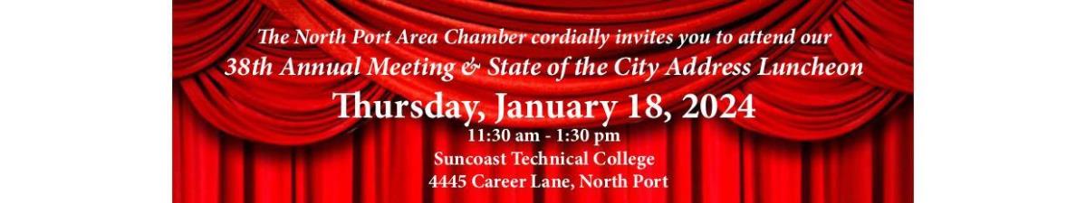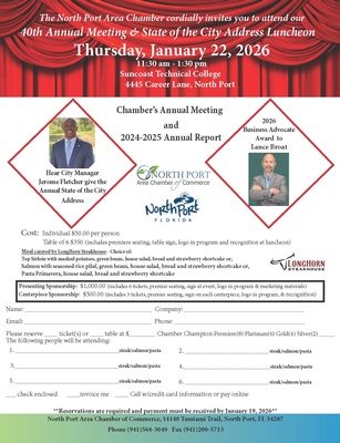 The North Port Area Chamber of Commerce cordially invites you to attend our 40thth Annual Meeting & State of the City Address Luncheon on Thursday, January 22, 2026. Hear City Manager, Jerome Fletcher, give the Annual State of the City Address, and share in the presentation of the 2026 Business Advocate Award to Lance Broat.