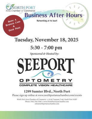 SeePort Optometry is our host for the November Business After Hours. The location is 1299 Sumter Blvd., North Port. The networking gets started at 5:30 PM, with a short program taking place after 6 PM. During that program, an update on Chamber committee activities will be given, along with announcements regarding upcoming events. Door prizes will be drawn for after the announcements. You are encouraged to bring a door prize to promote your business or organization.