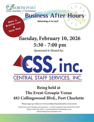 Central Staff Services, Inc. is our host for the February Business After Hours. This event is being held at The Event Groupie Venue located at 483 Collingswood Blvd., Port Charlotte. The networking gets started at 5:30 PM, with a short program taking place after 6 PM. During that program, an update on Chamber committee activities will be given, along with announcements regarding upcoming events. Door prizes will be drawn after the announcements. You are encouraged to bring a door prize to promote your business or organization.