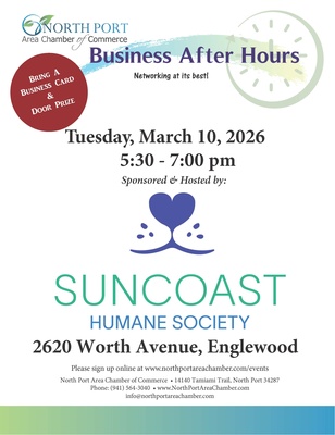 The Suncoast Humane Society located at 2620 Worth Avenue, Englewood is the host for our March Business After Hours. Networking gets started at 5:30 PM, with a short program taking place after 6 PM. During that program, an update on Chamber committee activities will be given, along with announcements regarding upcoming events. Door prizes will be drawn after the announcements. You are encouraged to bring a door prize to promote your business or organization.