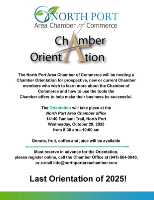 The North Port Area Chamber will be presenting an orientation on Wednesday, October 29, 2025 at 8:30 am. This event is FREE - great event for prospective members, new members and current members. Discover what tools are available for you through the Chamber. LAST ORIENTATION OF 2025!