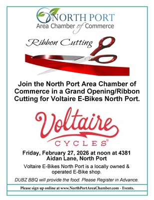 Please join the North Port Area Chamber of Commerce in a Grand Opening/Ribbon Cutting celebration for Voltaire E-Bikes North Port at noon on Friday, February 27, 2026, located at 4381 Aidan Lane, North Port. Voltaire E-Bikes North Port is a locally owned and operated e-bike shop.