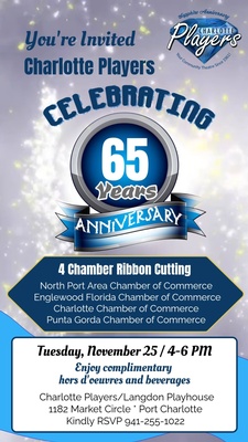 Join the North Port, Englewood, Charlotte and Punta Gorda Chambers as we celebrate a ribbon cutting and 65th Anniversary for the Charlotte Players. Enjoy complimentary hors d'oeuvres and beverages. Please register in advance.