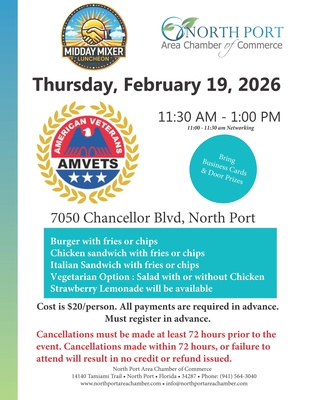 Amvets Post 312 will be the host for our February 19, 2026 Midday Mixer luncheon. Midday Mixer luncheons are an opportunity for Chamber members to stand up and give their thirty second "Elevator Speech" and talk about their business, product, or service. Hosted by a Chamber partner at a new location each month. Reservations are required. Cost of $20 per person.