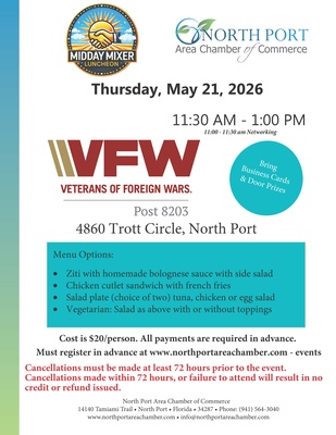 VFW Post 8203 will be the host for our May 21, 2026 Midday Mixer luncheon. Midday Mixer luncheons are an opportunity for Chamber members to stand up and give their thirty second "Elevator Speech" and talk about their business, product, or service. Hosted by a Chamber partner at a new location each month. Reservations are required. Cost of $20 per person.