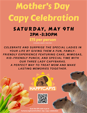 Celebrate Mother’s Day with a fun, family-friendly, unique experience featuring cake, mimosas, kid-friendly punch, and special time with our 3 capybaras.