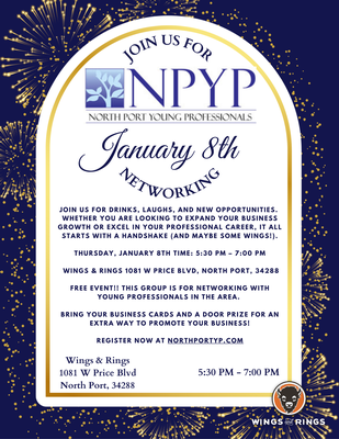 Join us for a night of networking with local young professionals at the Wings & Rings - 1081 W. Price Blvd., North Port. No cost to attend. Remember to bring your business cards and a door prize for an additional opportunity to promote your business. Use this link to register. https://northportyp.com/event/january-networking/