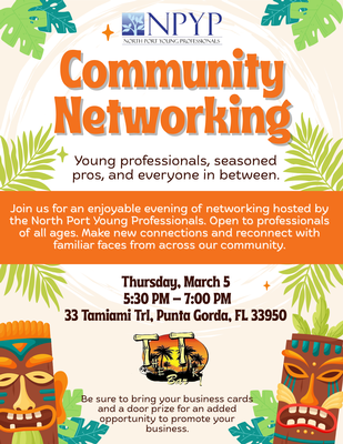 Join us for a night of networking with professionals at TT's Tiki Bar, 33 Tamiami Trail, Punta Gorda. No cost to attend. THIS EVENT IS OPEN TO PROFESSIONALS OF ALL AGES. Remember to bring your business cards and a door prize for an additional opportunity to promote your business. Use this link to register. https://northportyp.com/event/march-networking/