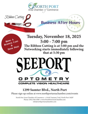 Join the Chamber for a Ribbon Cutting at SeePort Optometry at 5:00 pm on Tuesday, November 18, 2025. Immediately following the Ribbon Cutting, SeePort Optometry is hosting the November Business After Hours. The location is 1299 Sumter Blvd., North Port. The ribbon cutting is at 5:00 pm and the networking for the Business After Hours gets started at 5:30 PM, with a short program taking place after 6 PM. During that program, an update on Chamber committee activities will be given, along with announcements regarding upcoming events. Door prizes will be drawn for after the announcements. You are encouraged to bring a door prize to promote your business or organization.