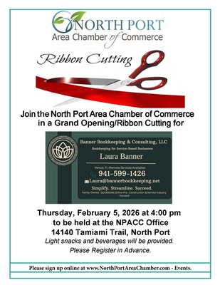 Join the North Port Area Chamber of Commerce for the Grand Opening/Ribbon Cutting of Banner Bookkeeping and Consulting, LLC on Thursday, February 5, 2026 at 4:00 at the NPACC Office - 14140 Tamiami Trail, North Port