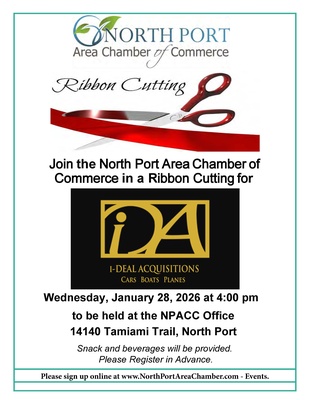 Join the North Port Area Chamber of Commerce for a Grand Opening/Ribbon Cutting of I-Deal Acquisitions on Wednesday, January 28, 2026, at 4:00 pm at the NPACC Office - 14140 Tamiami Trail, North Port. Snacks and beverages will be provided.