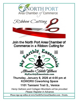 Join the North Port Area Chamber of Commerce for the Ribbon Cutting of My Earthly Essentials LLC on Thursday January 8, 2026, at 4:00 pm located at KOWORX Coworking Space - 1101 Tamiami Trail S. Venice. They will provide Hemp Seltzers and Collagen Mocktails.