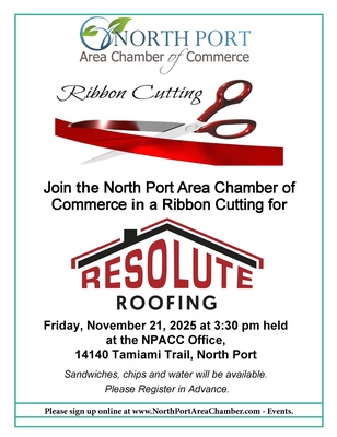 Rescheduled Event - Join the North Port Area Chamber of Commerce in a Ribbon Cutting of Resolute Roofing to be held on Friday, November 21, 2025 at 3:30 pm at the Chamber Office located at 14140 Tamiami Trail, North Port. Sandwiches, chips & water will be available. Please register in advance.