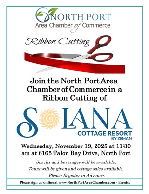 Join the North Port Area Chamber for a ribbon cutting for Solana Cottage Resort on Wednesday, November 19, 2025 at 11:30 am, located at 6165 Talon Bay Drive, North Port. Beverages and snacks will be available. Tours will be given and cottage sales available.