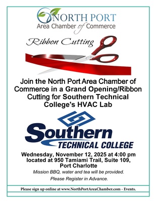 Join the North Port Area Chamber of Commerce for the Grand Opening/Ribbon Cutting of Southern Technical College's HVAC Lab on Wednesday, November 12, 2025, at 4:00 pm located at 950 Tamiami Trail, Suite 109, Port Charlotte.